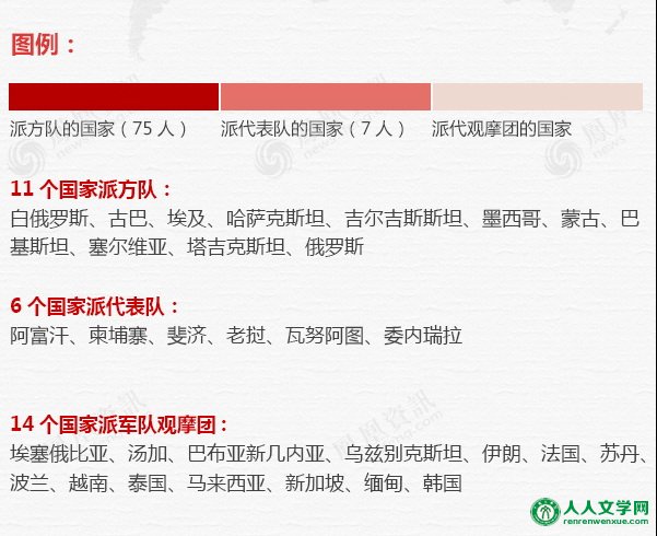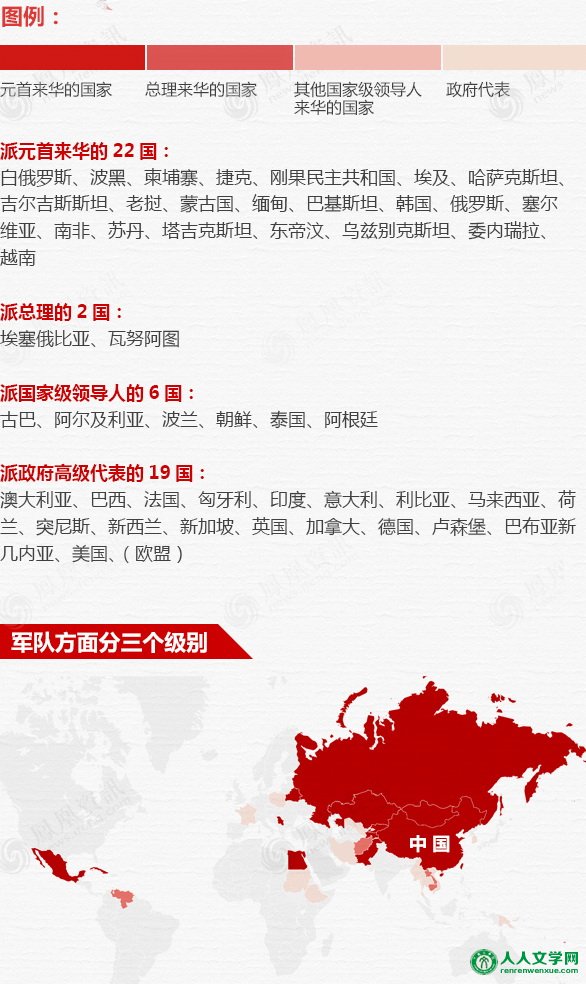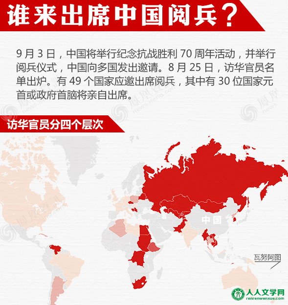 分析人士说,中国搞阅兵不是地缘政治行动,更不针对任何国家,因此中国不会以“外交战”的方式来追求各国出席阅兵官员的级别。有些西方媒体刻意突出西方大国领导人不来出席阅兵式,由此宣称北京阅兵受到国际社会“冷落”。分析人士说,这种说法非常狭隘。 外交部回应安倍不出席阅兵:日方表示首相有国会事务 国新办8月25日举行新闻发布会,外交部副部长张明回应了日本首相安倍因为“国会事务”不能出席9·3纪念活动等相关内容。 国务院新闻办公室今日举行中国人民抗日战争暨世界反法西斯战争胜利70周年纪念活动第六场专题新闻发布会。国务院新闻办公室副主任郭卫民主持并介绍情况,外交部副部长张明、文化部副部长董伟、国务院侨务办公室副主任何亚非和阅兵领导小组办公室副主任、总参作战部副部长曲睿出席并介绍情况,答记者问。 张明表示,注意到日方表示安倍首相因为“国会事务”不能出席9·3纪念活动。今年是中国人民抗日战争暨世界反法西斯战争胜利70周年,中国政府举办9·3纪念活动,目的是“铭记历史、缅怀先烈、珍爱和平、开创未来”。中国已多次指出,活动不针对特定国家,不针对今天的日本,更不针对广大日本人民,与当前中日关系没有直接关联。中国一向主张并将继续坚持在中日四个政治文件的基础上改善和发展中日关系。 17个外军方队和代表队来华参加阅兵(名单) 据国新办召开发布会,确认俄罗斯等11个国家派方队参加中国抗战阅兵。 阅兵领导小组办公室副主任、总参作战部副部长曲睿: 今天,我就外军参加纪念中国人民抗日战争暨世界反法西斯战争胜利70周年阅兵的相关情况作个介绍。中国人民抗日战争的胜利,既是中国人民的胜利,也是世界人民的胜利。外军方队、代表队参加阅兵,是这次阅兵的一大亮点。外国军队派方队、代表队和观摩团来华参阅或观礼,体现了纪念反法西斯战争胜利的国际性,体现了对世界持久和平的追求与向往,体现了与中国军队合作的高水平。 前期,我们向有关国家防务部门和军队发出了派方队和代表队参阅、派观摩团参加阅兵观礼的邀请。截至目前,白俄罗斯、古巴、埃及、哈萨克斯坦、吉尔吉斯斯坦、墨西哥、蒙古、巴基斯坦、塞尔维亚、塔吉克斯坦、俄罗斯等11个国家派方队参加阅兵,阿富汗、柬埔寨、斐济、老挝、瓦努阿图、委内瑞拉等6个国家派代表队参加阅兵,上述17个国家及埃塞俄比亚、汤加、巴布亚新几内亚、乌兹别克斯坦、伊朗、法国、苏丹、波兰、越南、泰国、马来西亚、新加坡、缅甸、韩国等,共31个国家表示将派军队观摩团来华参加阅兵观礼。对这些来自世界五大洲的外军方队、代表队和观摩团,我们表示热烈欢迎。 外军方队、代表队近1000人规模参加分列式,每个方队正式参阅人数在75人左右,每个代表队在7人左右,方队和代表队均位于我地面徒步方队和装备方队之间。各国军队参阅序列,按照国际惯例,原则上按所在国的英文首字母排序。 目前,17个来华参阅的外军方队、代表队,已经全部进驻阅兵训练基地。本着先到先训、随到随训的原则,相继展开了单方队训练以及与中方合练,其中8月20日、23日,分别参加了我们在阅兵训练基地和天安门地区组织的阅兵合练和预演,演练总体效果较好。下一步,我们将依托外军驻训点,组织进一步的固化和精准训练。 外军来华期间,我们充分尊重各国风俗习惯、文化传统和宗教信仰,合理安排参阅外军官兵的住宿、饮食和生活保障。坚持把文化交流作为增进友谊的重要途径,科学安排各种文化活动。基于共同纪念世界反法西斯战争胜利的考虑,为每个外军方队、代表队颁发纪念牌,为每名参阅的外军官兵颁发纪念章。 我们坚信,我军与参阅国军队共同参加纪念活动,有利于进一步增强互信、发展友谊、促进合作。