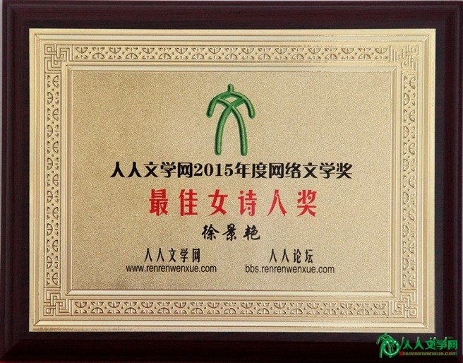 ![]() 最佳女诗人奖——徐景艳 ![]() 最佳女诗人奖:徐景艳【颁奖辞】【获奖感言】 【代表作】 诗歌作品:《旷谷幽兰诗歌集》 【颁奖辞】 用“才女”一词形容旷谷幽兰,一点都不为过。她擅长文学各种文体创作,是一位很有潜力的青年作家。她精通音乐,创作过大量歌词,是有名的电台音乐人。她的诗歌、散文、小说、诗词、歌词都创作过大量作品,取得过骄人的成绩。她勤奋好学,做事认真,性格直率,直言不讳,具有超强的组织与管理能力。文学作品语言风格独特,对语言有超强的组织手法。 她的诗歌,语句精炼,语言生动,弛张有度,文采斐然。 她的散文,追求唯美,文笔细腻,语言像诗一样柔美,充满浪漫。 她的小说,细腻详实,生动通俗,深入生活,感人至深,成功塑造出多个人物形象,很多情节让人拍案叫绝。 她的诗词,词风婉约,惆怅清丽,回味悠长,词牌工整,功底深厚。 人人文学网2015年度网络文学奖最佳女诗人奖,非幽兰莫属。