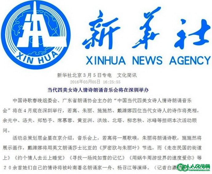 ![]() 新华社通稿:当代四美女诗人情诗朗诵音乐会将在深圳举办