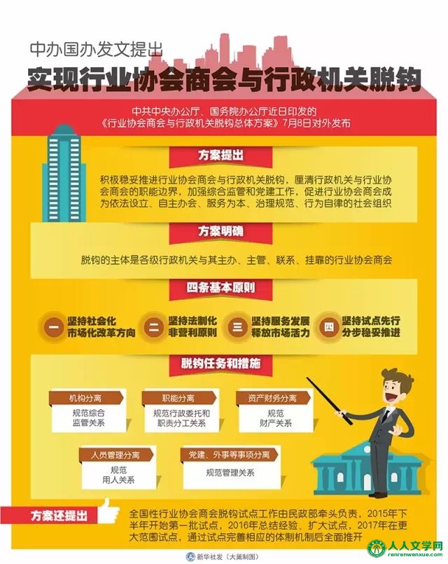 新华社北京7月8日电 中共中央办公厅、国务院办公厅近日印发了《行业协会商会与行政机关脱钩总体方案》,并发出通知,要求各地区各部门结合实际认真贯彻执行。 《行业协会商会与行政机关脱钩总体方案》全文如下。 行业协会商会是我国经济建设和社会发展的重要力量。改革开放以来,随着社会主义市场经济体制的建立和完善,行业协会商会发展迅速,在为政府提供咨询、服务企业发展、优化资源配置、加强行业自律、创新社会治理、履行社会责任等方面发挥了积极作用。目前,一些行业协会商会还存在政会不分、管办一体、治理结构不健全、监督管理不到位、创新发展不足、作用发挥不够等问题。按照《中共中央关于全面深化改革若干重大问题的决定》、《国务院机构改革和职能转变方案》有关精神和工作部署,为加快转变政府职能,实现行业协会商会与行政机关脱钩,促进行业协会商会规范发展,制定本方案。 一、总体要求和基本原则 (一)总体要求 贯彻落实党的十八大和十八届二中、三中、四中全会精神,加快形成政社分开、权责明确、依法自治的现代社会组织体制,理清政府、市场、社会关系,积极稳妥推进行业协会商会与行政机关脱钩,厘清行政机关与行业协会商会的职能边界,加强综合监管和党建工作,促进行业协会商会成为依法设立、自主办会、服务为本、治理规范、行为自律的社会组织。创新行业协会商会管理体制和运行机制,激发内在活力和发展动力,提升行业服务功能,充分发挥行业协会商会在经济发展新常态中的独特优势和应有作用。 (二)基本原则 坚持社会化、市场化改革方向。围绕使市场在资源配置中起决定性作用和更好发挥政府作用,改革传统的行政化管理方式,按照去行政化的要求,切断行政机关和行业协会商会之间的利益链条,建立新型管理体制和运行机制,促进和引导行业协会商会自主运行、有序竞争、优化发展。 坚持法制化、非营利原则。加快行业协会商会法律制度建设,明确脱钩后的法律地位,实现依法规范运行。建立准入和退出机制,健全综合监管体系。各级政府要明确权力边界,实现权力责任统一、服务监管并重。按照非营利原则要求,规范行业协会商会服务行为,发挥对会员的行为引导、规则约束和权益维护作用。 坚持服务发展、释放市场活力。提升行业协会商会专业化水平和能力,推动服务重心从政府转向企业、行业、市场。通过提供指导、咨询、信息等服务,更好地为企业、行业提供智力支撑,规范市场主体行为,引导企业健康有序发展,促进产业提质增效升级。 坚持试点先行、分步稳妥推进。在中央和地方分别开展试点,设置必要的过渡期,积极探索,总结经验,完善措施,逐步推开。根据行业协会商会不同情况,因地因业因会逐个缜密制定脱钩实施方案,具体安排、具体指导、具体把握,确保脱钩工作平稳过渡、有序推进。 二、脱钩主体和范围 脱钩的主体是各级行政机关与其主办、主管、联系、挂靠的行业协会商会。其他依照和参照公务员法管理的单位与其主办、主管、联系、挂靠的行业协会商会,参照本方案执行。 同时具有以下特征的行业协会商会纳入脱钩范围:会员主体为从事相同性质经济活动的单位、同业人员,或同地域的经济组织;名称以“行业协会”、“协会”、“商会”、“同业公会”、“联合会”、“促进会”等字样为后缀;在民政部门登记为社会团体法人。 个别承担特殊职能的全国性行业协会商会,经中央办公厅、国务院办公厅批准,另行制定改革办法。 三、脱钩任务和措施 (一)机构分离,规范综合监管关系 取消行政机关(包括下属单位)与行业协会商会的主办、主管、联系和挂靠关系。行业协会商会依法直接登记和独立运行。行政机关依据职能对行业协会商会提供服务并依法监管。 依法保障行业协会商会独立平等法人地位。按照有利于行业发展和自愿互惠原则,对行业协会商会之间、行业协会商会与其他社会组织之间的代管协管挂靠关系进行调整,并纳入章程予以规范。鼓励行业协会商会优化整合,提高服务效率和水平。 调整行业协会商会与其代管的事业单位的关系。行业协会商会代管的事业单位,并入行业协会商会的,注销事业单位法人资格,核销事业编制,并入人员按照行业协会商会人员管理方式管理;不能并入行业协会商会的,应当与行业协会商会脱钩,根据业务关联性,在精简的基础上划转到相关行业管理部门管理,并纳入事业单位分类改革。 行政机关或事业单位与行业协会商会合署办公的,逐步将机构、人员和资产分开,行政机关或事业单位不再承担行业协会商会职能。 (二)职能分离,规范行政委托和职责分工关系 厘清行政机关与行业协会商会的职能。剥离行业协会商会现有的行政职能,法律法规另有规定的除外。业务主管单位对剥离行业协会商会有关行政职能提出具体意见。 加快转移适合由行业协会商会承担的职能。行政机关对适合由行业协会商会承担的职能,制定清单目录,按程序移交行业协会商会承担,并制定监管措施、履行监管责任。 (三)资产财务分离,规范财产关系 行业协会商会应执行民间非营利组织会计制度,单独建账、独立核算。没有独立账号、与行政机关会计合账、财务由行政机关代管或集中管理的行业协会商会,要设立独立账号,单独核算