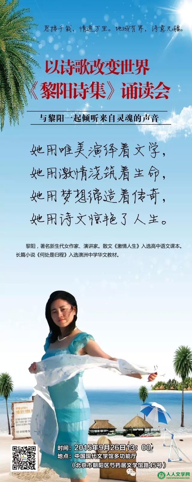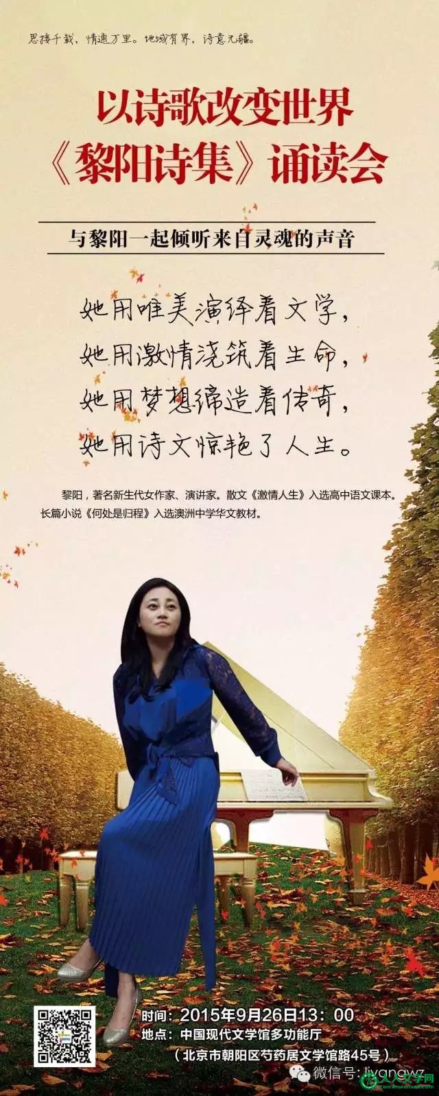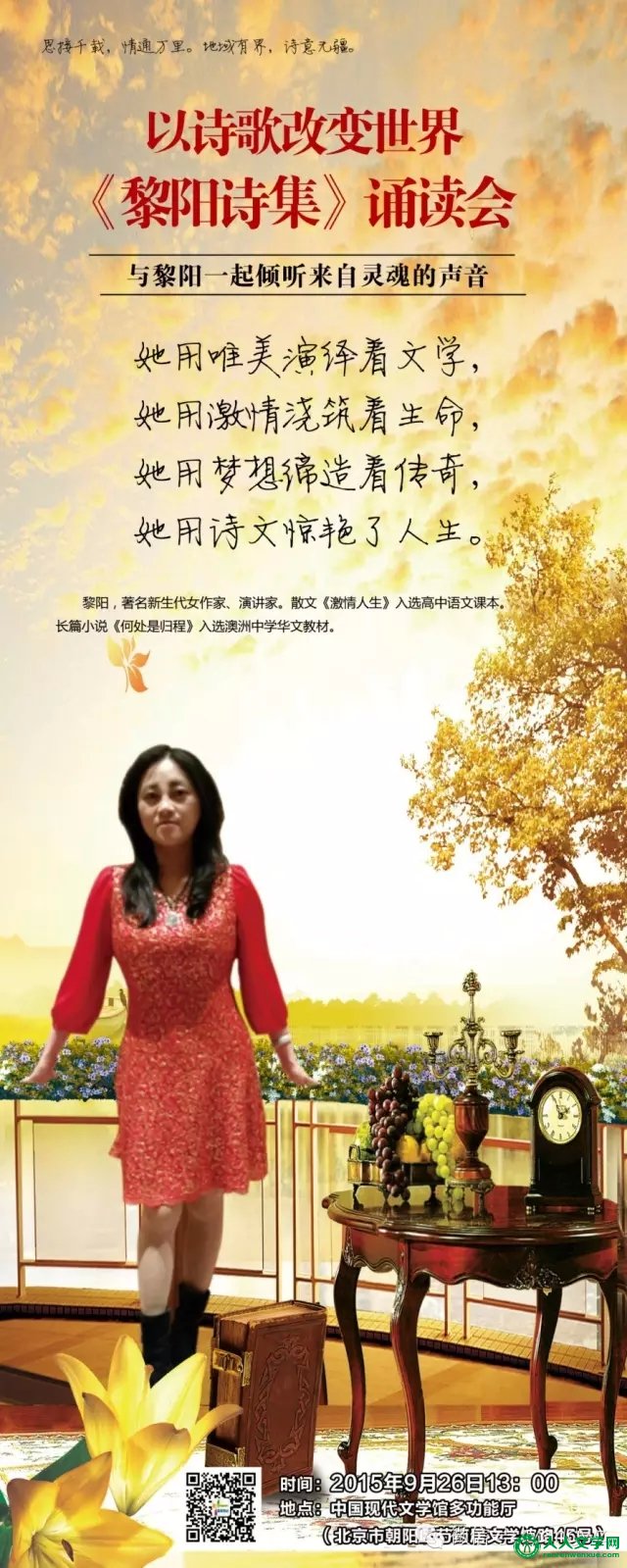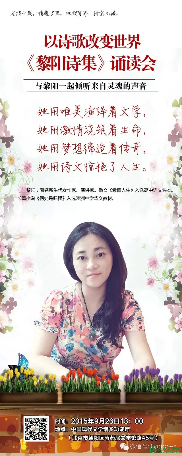 她穿越了上古的时空,她从金戈铁马中走来,带着一路的风尘,在“上有浩浩渺渺之苍穹,下有战战兢兢之群臣”中追寻着始皇的传说: “挥鞭逐六国,胆破诸候来。”她走过了江山塞漠,她梦回着楼兰古国,携着一腔的豪情,“莽苍踏沙行,倚剑白云天”。在羌笛曲曲中,在战马啾啾嘶鸣里,感怀着月夜,心驰着秦川,挥洒着笔墨,成就着诗篇。 唐朝烟雨宋朝风,她在黄鹤楼前相思着太白:“长相思,思太白。黄河之水天上来,奔流无际从此开。月下不必忧独酌,有我与你共徘徊。”她在漱玉泉边,寻觅着清照:“让多少须眉男儿,低下了额头,望穿了山丘!”弹指间,千帆过境;一刹那,转身百年。 她在西子湖畔浅斟低吟,她在琼海之滨浓墨重彩。思接千载,情通万里。地域有界,诗意无疆。字里行间,便唱尽了千年长叹,书写了万里河山。 谁在遥望,鹭湖的中央?她沉醉在《诗经》的意境中,“聚也思量,散也难忘”,任“花自飘香,水自流淌”,温柔在锦秀的长廊。清风细雨中的忧伤,镜花水月里的牵挂,化作了波光里的滟影,满载着一船的星辉,在新月派的遗风流韵里,让诗歌的国度玫瑰遍种。 她从东到西,从南到北。她在罗马的风景前驻足,她在巴黎的浪漫中散步。她聚散着西雅图,她相思着墨尔本。她绚烂了维也纳,她钟情在卡萨布兰卡。她倾倒在大洋路上,看“南太平洋在痴情地守望,守望这亿万年的沧桑。十二门徒在虔诚地祈祷,祈祷这斗转星移的寻常。将大地山河,一担轻装。”她陷入了岘港的温柔港湾,任“白云悠悠,急流险滩追波逐浪。宿命与轮回,唤取红巾翠袖绚烂了百里长滩。”她从一个国度跨越另一个国度,从一种文明跨越到另一种文明,从一个千年跨越到另一个千年。 她用唯美演绎着文学,她用激情浇筑着生命,她用梦想缔造着传奇,她用诗文惊艳了人生。她——就是黎阳。