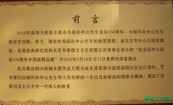 人人书画网讯(摄影  高群、王博生、王毅、苗文录、孙振山、布连军):2016年3月18日上午,由北京中山公园管理处、北京走进崇高研究院主办、北京书香继文文化有限公司、世界孙氏联谊总会文化工作委员会承办,新华社中国图片社中国影像版权服务平台、人人书画网协办,在北京市中山公园,举办纪念孙中山先生诞辰150周年暨《孙志江国画精品展》。通过举办本次活动,学习、继承和发扬孙中山先生的爱国思想、革命进取精神,唤起两岸三地华人及台湾地区青年学子对中华文化的认知与了解,在中山先生精神的感召下凝聚对中华文化的向心力,巩固和发展海内外中华儿女大团结。传承孙中山先生精神,激励我们一代又一代的有志青年进步。以书画艺术交流为依托,让两岸关系从和平走向统一。
