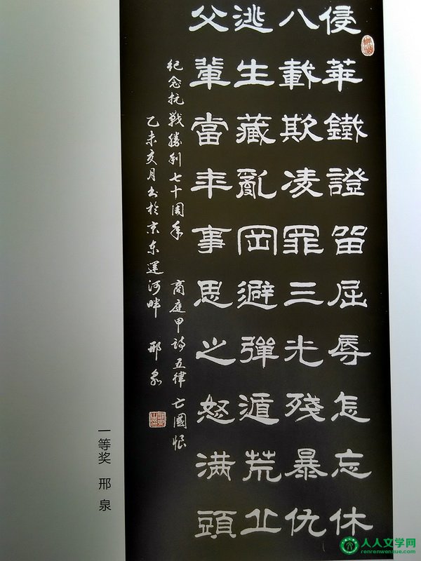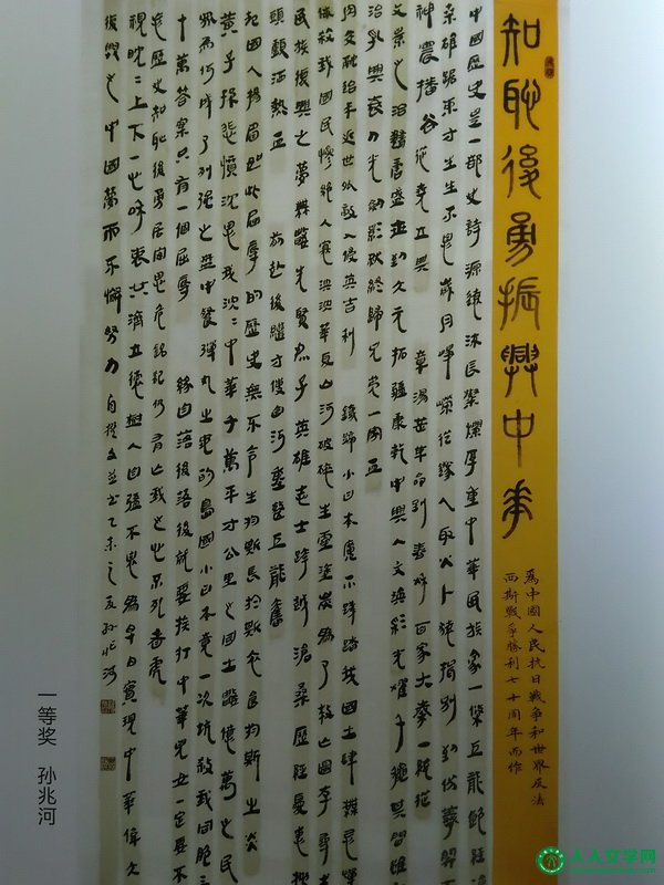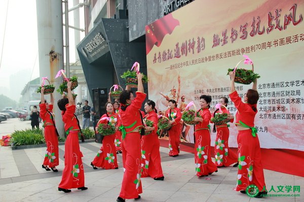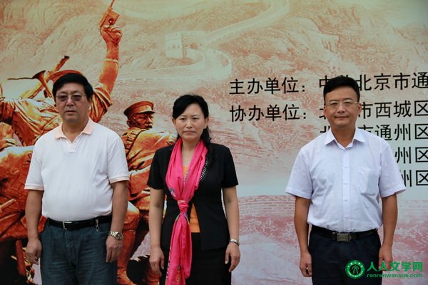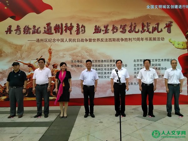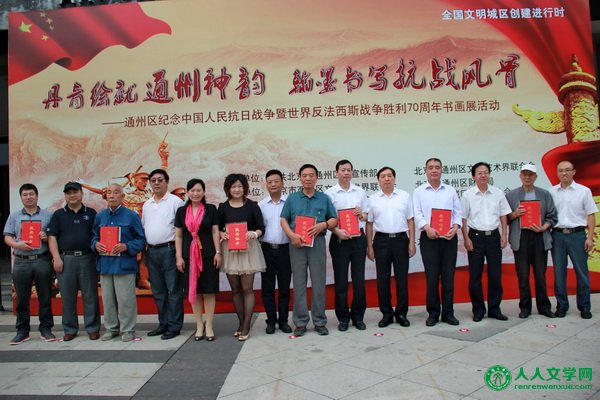 人人文学网、人人书画网讯:(摄影:博生)2015年9月17日,为纪念中国人民抗日战争胜得70周年,歌颂为中华民族的独立和解放而英勇献身的先烈,大力弘扬爱国主义和民族精神,由中共北京市通州区委宣传部、北京市通州区文联主办的,北京市西城区文联、北京市通州区财政局、北京市通州区书法家协会、北京市西城区美术家协会、北京市通州区美术家协会、大运会美术馆、北京市通州区文化宫、北京市通州区国有资产运营公司联合举办的“丹青会就通州神韵 翰墨书写抗战风骨——通州区纪念中国人民抗日战争暨世界反法西斯战争胜利70周年书画展”活动在北京美术的大运河畔拉开帷幕。北京市文联党组副书记刚杰、区委常委、宣传部长肖志刚等领导以及艺术家、获奖作者、书法爱好者、社区文艺骨干、社区居民百余人参加此次活动。展期约一周。
