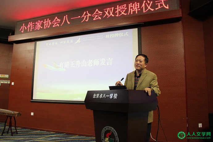 北京市作协副主席、秘书长王升山向八一学校授牌。