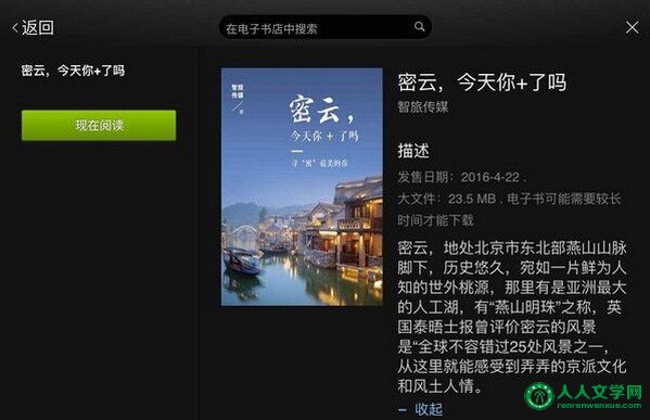4月23日,是世界读书日,也是电子书《密云,今天你 + 了吗》在亚马逊首发日,随后京东、当当、掌阅、多看、苹果、豆瓣、百度、腾讯、网易等主流电子书销售渠道且均可购买下载阅读。