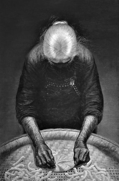 老通宝像一匹疯狗似的咆哮着,火红的眼睛一直盯住了阿多的身体,直到阿多走进屋里去,看不见了,老通宝方才提过那“蚕台”来反复审察,慢慢地动手修补。木匠生活,老通宝早年是会的;但近来他老了,手指头没有劲,他修了一会儿,抬起头来喘气,又望望屋里挂在竹竿上的三张蚕种。