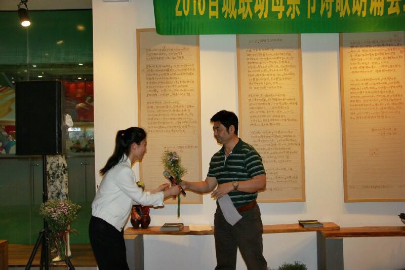 与会诗人合影 附: 到场诗人朗诵诗歌作品名单 潇 潇 《穷人之母》 七 月 《风》 花 语 《感谢母亲》 屈金星 《嫘祖赋——讴歌中华母亲》 夏 花 《赞美》 杨奕黎 《因为爱你》 张恩泽 《跟着月儿回家》 蔡艳梅 《母亲的微笑》 樊金玲 《写给母亲的诗》 阿 B 《旗袍,母亲时代》 贾荣香 (云水音)《叫一声妈》 王博生 《最后一面》 刘雅阁 《镜中的母亲》 梅 林 《妈妈的忙》 一米阳光 《母亲老了》 弱 水 《西单天桥上的母亲》 张恩泽 (刘不伟 )《写给女儿》 武眉凌 《母亲,诗歌》 王 童 《母亲的海》 高 妍 (梅 尔)《沉沉的家书》 诗作欣赏: