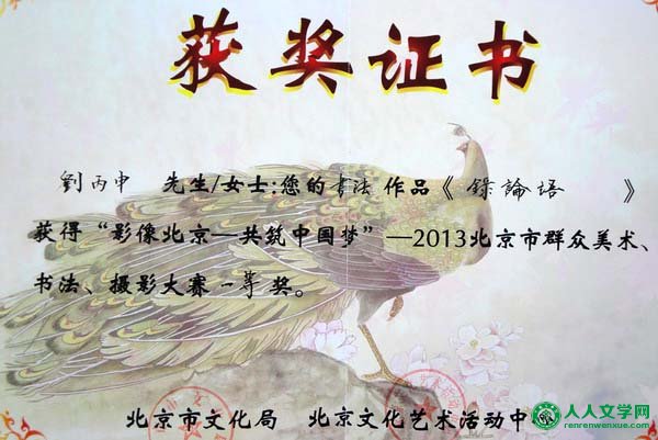 刘丙申获“影像北京——共筑中国梦”——2013北京市群众美术、书法、摄影大赛一等奖