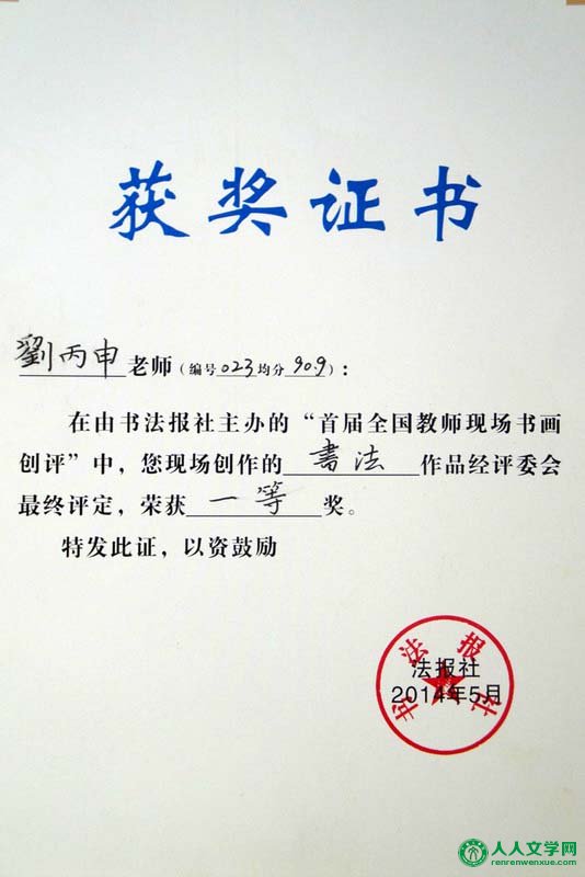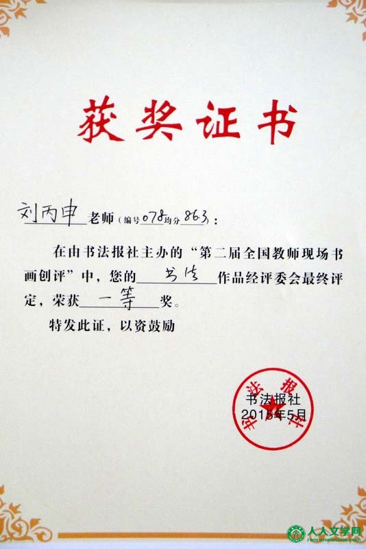 刘丙申获中国书法报主办的“首届全国教师现场书法评论”荣获一等奖