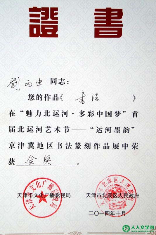 刘丙申获“魅力北运河  多彩中国梦”首届北运河艺术节篆刻作品展获金奖