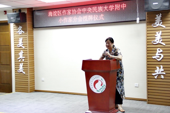 民附校长田琳接受“海淀区作家协会民附基地”的授牌。 《北京文学》主编王秀云在会上发言。