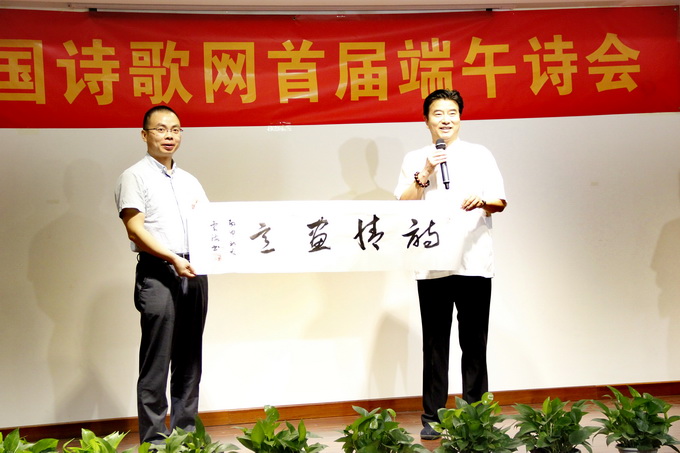 张云海赠送书法“诗情画意” 中国诗歌网负责人杨志学以及中国诗歌网驻站诗人、诗评专家宗焕平、洪烛、王改正、莫真宝、班清河、江岚、韩红月、宗德宏、赵国培、查曙明、赵智、胡勇、张富英、安琪、蓝珊、任启发、王博生、超侠等三十余位参加了此次端午诗会,并朗诵自己的诗歌作品。